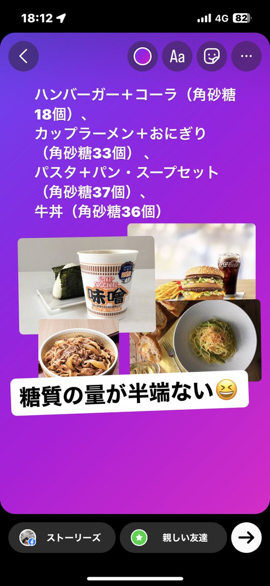 ハンバーガー+コーラ(角砂糖18個)、カップラーメン+おにぎり(角砂糖33個) 、パスタ+パン・スープセット(角砂糖37個)、牛丼(角砂糖36個)。